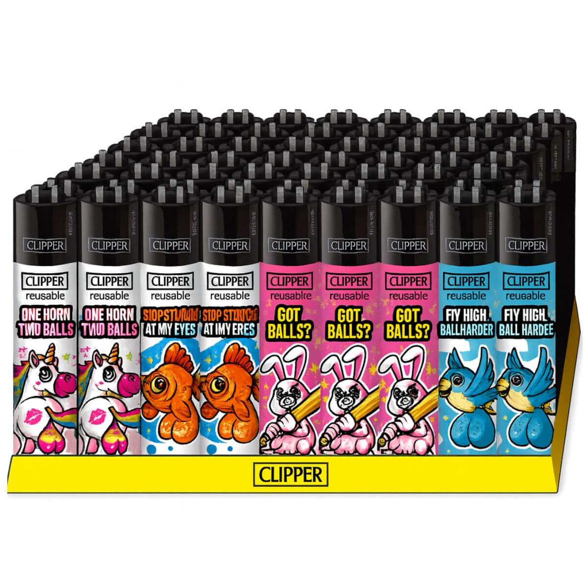 Das Clipper Classic Big Balls (48 Stk./Display) ist ein humorvolles, an Erwachsene gerichtetes Feuerzeugsortiment mit auffälligen und verspielten Designs im bewährten, wiederverwendbaren Format von Clipper. Ausgestattet mit einem nachfüllbaren Gastank, einem austauschbaren Feuersteinsystem und einem robusten Nylongehäuse bieten diese Feuerzeuge langlebige Funktionalität gepaart mit sammelwürdiger Optik. Ideal für Lifestyle-Einzelhändler, Headshops und Impulskaufzonen sorgt dieses Display für konstanten Umsatz und eine starke Kundenbindung.