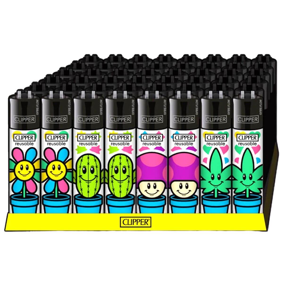- 48 Clipper Classic Grow Pots nachfüllbare Feuerzeuge in einer einzigen Displaybox, bereit für die sofortige Einzelhandelspräsentation.