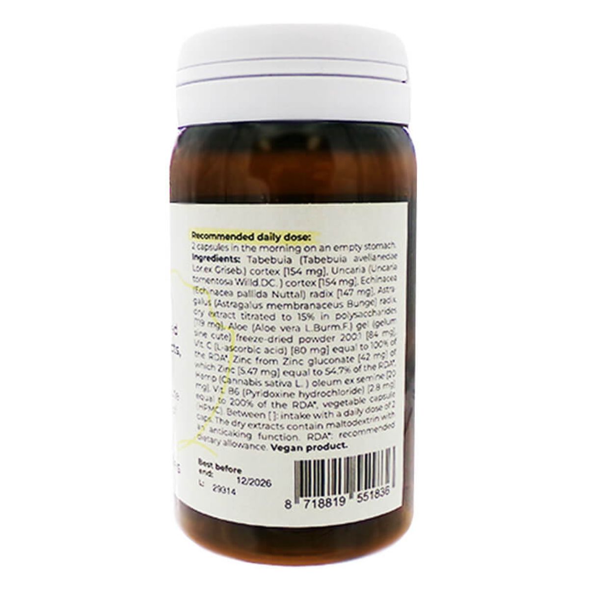 Zutaten: Tabebuia (Tabebuia avellanedae Lor.ex Griseb.) Rinde [154 mg], Echinacea (Echinacea pallida Nuttal) radix [147 mg], Astragalus (Astragalus membranaceus Bunge) radix. Trockenextrakt titriert auf 15% Polysaccharide [119 mg], Aloe (Aloe vera L.Burm.F.) Gel (gelum sine cute) gefriergetrocknetes Pulver 200:1 [84 mg], Vit. C (L-Absorbinsäure) [80 mg] entspricht 100% der RDA*, Zink aus Zinkgluconat [42 mg], davon Zink [5.47 mg] gleich 54,7% der RDA*, Hanf (Cannabis sativa L.) oleum ex semine [20 mg], Vit. B6 (Pyridoxinhydrochlorid) [2,8 mg] gleich 200% der RDA*, pflanzliche Kapsel (HPMC). Die Trockenextrakte enthalten Maltodextrin mit einer Antibackfunktion. RDA*: empfohlene Verzehrsmenge. Veganes Produkt.
